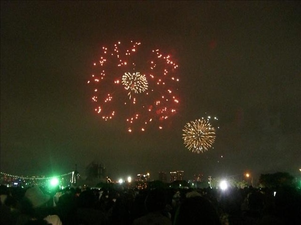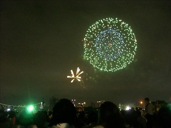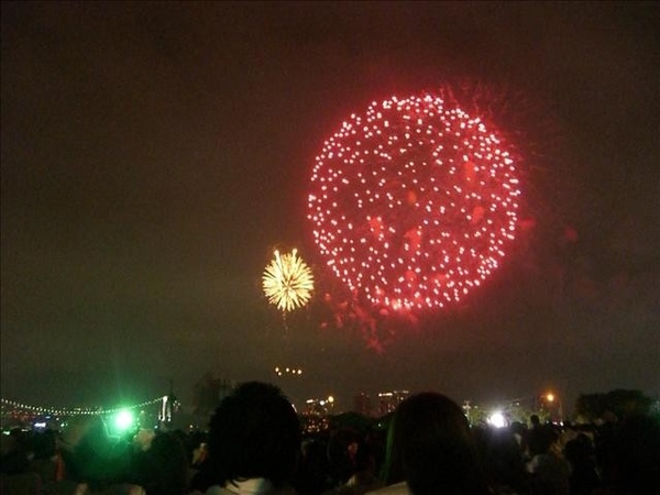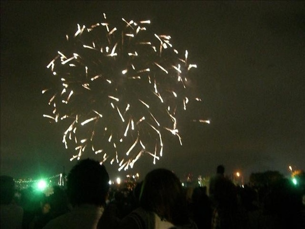 我們從5:30集合,跟著人潮走到會場,有地方坐下來時已是6:45吧。花火施放時間是晚上7:00到8:10,後來應該是有延長到8:30。整場下來,讚歎聲不多,不知道是真的很普通,還是大家跟我一樣也看北京奧運開幕煙火。